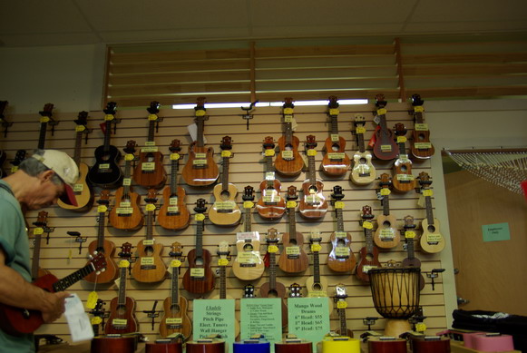 | Hiloの街のおみやげ屋さんみたいなところにもウクレレが沢山おいてあったが,こちらは全てアジア製. 唯一ponoがおいてあるのが救いか.他はKALA(中国製)だったり,オスカーシュミット(インドネシア製)だ. |