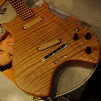 | これはエレキウクレレ.ソリッドボディのソプラノサイズ. 指板にはハワイのペトログラフのプリントが入る.おみやげ物っぽい雰囲気だがキチンと作られている.価格は$700近いのでかなり高価だ. |